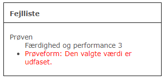 Dette betyder, at den gamle værdi ikke længere er tilgængelig og at du skal vælge en prøveform blandt de nye, før du kan publicere modulet på ny.